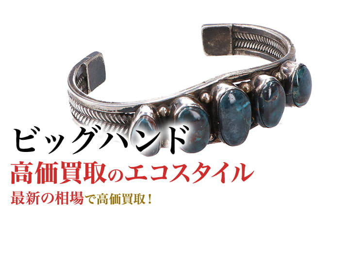 ビッグハンド(BIG HAND)は、1987年に創立されたシルバーアクセサリーのブランドです。日本においてシルバースミス(銀職人)の草分け的存在で、こだわりとプライドを持った熟練のシルバースミスの団体組織です。 ジュエリーは身につけてこそ輝くという信念のもと、全てのアクセサリーを地金から丁寧に手作りするオーダーメイドで、シンプルながらも重厚で骨太なアイテムは、男女を問わず幅広い層の人々から熱狂的な支持を集めています。ビッグハンドの代名詞ともいえるモチーフは、太陽SUN、イーグル、フェザーなどで、それぞれ、太陽は「輝く自分」、イーグルは「向上心」、フェザーは「旅のお守り」などの意味が込められています。 ビッグハンドが得意とするのはリングで、その小さな空間にシルバーを知り尽くした職人ならではの繊細な手仕事が見て取れます。また、それぞれに素晴らしい世界観が込められており、二つとない逸品ばかりです。リング以外にもペンダントトップやピアス、マネークリップなども制作しています。また、リングの次に人気があるのがブレスレットやバングルです。上質で洗練されたデザインは、老若男女問わず人気のあるアイテムです。他にもシルバーと相性の良いレザーアイテムも人気の商品です。ビッグハンドのアクセサリーは一点物が多いだけに、自分好みのデザインのものならどうしても手に入れたいと思うファンが多くいます。そのため、当店ではビッグハンドの買取を強化しています。