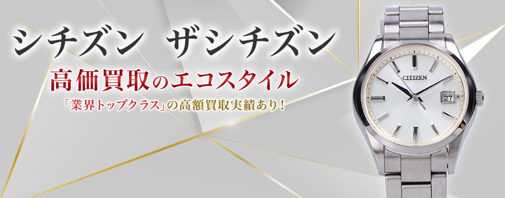 シチズンは1918年に尚工舎時計研究所として創業された日本の時計メーカーでございます。1924年(大正13年)に懐中時計「CITIZEN」を発売し、これが「シチズン」ブランドの発端となります。電磁テンプ式時計の国産化にいち早く成功したブランドでセイコーと共に日本の時計産業をリーディングし続けています。クォーツ式ムーブメントをベースにした最新技術を盛り込んだ高機能ウォッチを主張に生産しており、その巧みな時計作りは世界的にも高く評価されています。光発電技術「エコドライブ」、純チタニウムに表面硬化技術デュラテクトを施した「スーパーチタニウム」、独自に開発した表面硬化技術「デュラテクト」、サファイアガラスにシリコン化合物を多層構造コーティングし視認性を上げた「99%クラリティコーティング」などその高い技術力は他の時計メーカーとも一線を画しております。日本が世界に誇るメイドインジャパンの国産時計メーカーがシチズンです。エコスタイルではそんなシチズンのスタンダードモデル「ザシチズン」を高額買取しております。流行に流されない普遍的でシンプルなデザインと、最新技術を盛り込み時計としての基本性能を極限まで高めたザシチズンは多くのファンを魅了しており当店でも販売要望の多いモデルとなっています。使わなくなった「ザシチズン」の時計がございましたら是非エコスタイルにお売り下さい。スーパーチタニウムモデル、ステンレスモデル、メンズ、レディース問わずに買取募集中です。壊れているモデルや現品のみの時計もお気軽にご相談下さい。シチズンの買取ならブランド時計買取リサイクルショップのエコスタイルにお任せ下さい。