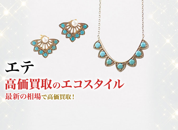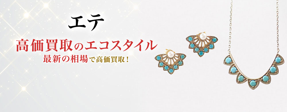 エコスタイルではエテが展開するリングなどをお見積り出来る事を楽しみにしております。長くご愛用されていたお品物からあまり使っていなかったお品物までもちろん大歓迎です。購入時に付属していた箱などがない現品のみの状態でも買取可能でございます。エテのアクセサリーなどをご売却の際はぜひエコスタイルにご相談くださいませ。エテの買取ならエコスタイルにお任せください。