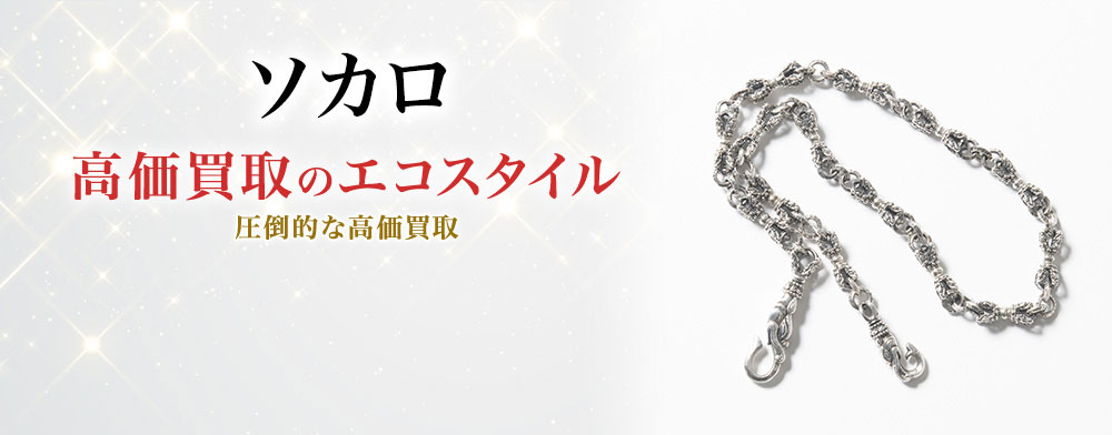 「ソカロ(ZOCALO)」は、主にシルバーアクセサリーを展開している、ジュエリー・アクセサリーブランドです。大学在学中にバック・パッカーとして世界中を旅し、ファッションビジネスについても海外で学び、メキシコのTAXCOにて修行した高良和晶がデザイナーを務めています。 世界中の芸術や宗教といった文化遺産をモチーフにアクセサリーを展開しているブランドです。「ソカロ」のブランドコンセプトとして、「時空を超えて」「「本能が惹かれるスピリチュアルなデザインワーク」をコンセプトに提案されるアイテムは、高い技術と上質な素材、繊細なディテールで見る人を虜にします。少し変わったアクセサリーやファッションを好む人や、こだわりの強い人々に人気のあるブランドです。エコスタイルではソカロのアイテムを強化買取しています。「ソカロ」のシルバーアクセサリーには、それぞれにルーツがありシリーズ化されているものもあり、神秘的なデザインに加えて見た目にもインパクトがあります。 中でも人気の高い、ドージェシリーズのアイテムは人気が高くぜひ買取させていただきたい逸品です。その他、ダガーやクロス、キーのモチーフなどどんなものでも大歓迎!リング、ペンダント、ブレスレット、ウォレットチェーンや財布などどんなアイテムでも喜んで買取させていただきます。ソカロのアイテムはエコスタイルに買取させてください。