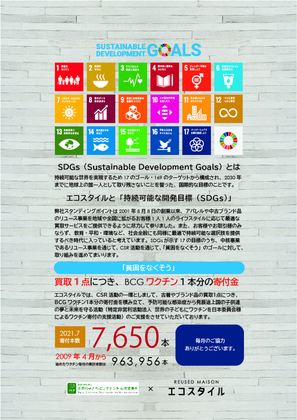 先月のワクチン活動の詳細は下記のページをご覧ください。エコスタイルはSDGs(持続可能な開発目標)に取り組むリユース企業です。