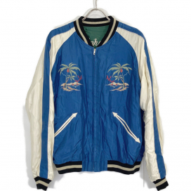 テーラー東洋のTT15273-145は、同ブランドが得意とする1950年代のスーベニアジャケットを忠実に再現したリバーシブル仕様のスカジャンです。表面には富士山を中心に、力強く対峙する鷲と龍の刺繍が施され、ヴィンテージスカジャンらしい迫力ある佇まいを感じさせます。裏面は一転してハワイの島々を描いたマップ柄となり、ヤシの木や南国の花、ウクレレなど、陽気でレトロなムードを演出。アセテート生地ならではの滑らかな光沢と軽やかな着心地により、季節を問わず楽しめるのも魅力です。グリーンベースのカラーが程よい存在感を放ち、伝統的な刺繍技術と確かな再現力が光る、まさにテーラー東洋を象徴する一着といえるモデルです。
