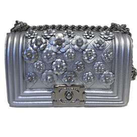 今回ご紹介するお品物は、ボーイシャネルのショルダーバッグです。カラーはシルバーでフラップ部分にはカメリアの装飾が施されております。カラーリングはブランドの中でも珍しいシルバーを採用しており、他のアイテムとは一線を画すアイテムとなっております。
