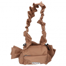今回のお品物は、OUTDOORコラボの25SSのギャザーストラップリボンバッグです。 アウトドアのオリジナルのバッグフォルムをベースに、大きな存在感のあるリボンモチーフでミュベールらしさもあるアイテムです。 ストラップにギャザーを寄せたり、リボンを自由に結び直すことができるため、様々な表情を楽しむことができる点がポイントです。ナイロン生地のため軽量で、コンパクトなサイズ感ですが、コーディネートのポイントにもなる存在感のあるバッグです。
