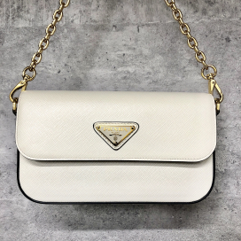 今回のお品物は、プラダのショルダーバッグです。こちらは比較的、最近登場したモデルで、小豆チェーンとレザーストラップの2種が付属しており、気分で付け替えが可能です。ホワイト×ゴールドのカラーリングがラグジュアリーな印象を与えてくれますね。ブラックと2色で展開されており、どちらも捨てがたいところです。サフィアーノレザーは、きめ細かな型押しが施されていることで汚れや傷がつきにくいため、ホワイトカラーも安心して使えます。