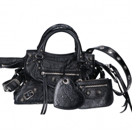 今回のお品物は、アイコニックな「シティ」と「カゴール」のディテールを融合させたモデルです。アリーナラムスキンは特有のシワ加工がされているため、傷が目立ちにくく、使うほどに風合いが増す魅力があります。スタッズやミラー、ハート型のポーチなど、エッジの効いた装飾が印象的ですね。