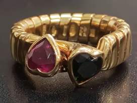 今回のお品物は、トゥボガスのピンクトルマリンとペリドットがデザインされたハートのリングです。トゥボガス特有のヘビのようなデザインと愛らしいハートのデザインがしっかりとマッチしていますね。イタリアのジュエリーブランドらしいクラシカルで適度なボリューム感もあり、現在においても非常に人気の高いアイテムです。