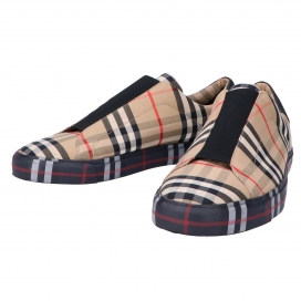 ヴィンテージチェックのコットンとスムースレザーのスリッポンスニーカーでコントラストの効いたチェックのソールと、伸縮性のあるフロントパネルがコーディネートのアクセントになる一足です。ヴィンテージチェックが誕生したのは1920年代のことで、当時はレインウェアの裏地としてデザインされましたが、1960年代に傘のデザインとして使用されたことを皮切りに、バッグやマフラーなどさまざまなアイテムに使われ、キャメルをベースに黒・白・赤のラインで構成したタータンチェックはクラシカルな印象で、今なお世界中で親しまれています。