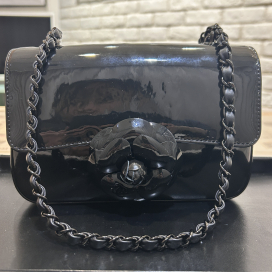 今回のお品物は、シャネルの代表的なモチーフのカメリアがバッグの中心にあり、華やかな印象のバッグです。パテント素材ですので、光沢感がありますが、チェーン金具もブラックで統一されたシックなデザインは幅広いコーディネートにマッチします。