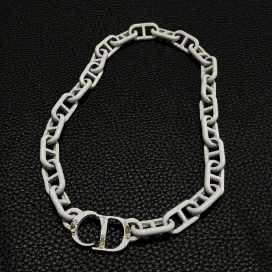 今回のお品物は、クラッシュ加工がされたCDロゴのチェーンネックレスです。ホワイトのカラーが顔周りを華やかにしてくれる素敵なネックレスですね。比較的大ぶりのネックレスですので、男性が着用しやすいネックレスではないでしょうか。