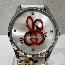 今回ご紹介するのは、卯年のお祝いから生まれた2023年のカプセルコレクションから、ハンドペイントのウサギロゴが印刷されたGタイムレスウォッチです。ロゴのGGの文字をウサギにアレンジしており、ベルト部分にもカラフルにデザインされています。