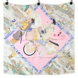 今回はカレの90サイズです。和をモチーフとした浮世絵のような風情あるイラストの大判スカーフです。スカーフとして使用することも出来ますし、額に入れて絵画としてご自宅などに飾る方などもいらっしゃいます。