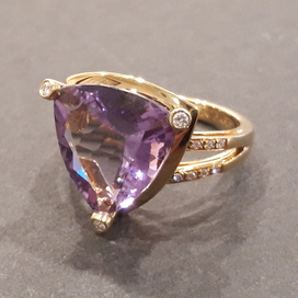 今回お買取させて頂いたのは、そんなモーブッサンのK18アメジストリングです。紫石の代表格であるアメジストをあしらった品格あるジュエリーとなっています。現品のみの状態ではございましたが、モーブッサンは在庫も少なく当店でもぜひ欲しいアイテムでしたので買取価格も目一杯頑張らせて頂きました。ありがとうございます!