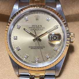 ステンレススチールとイエローゴールドを組み合わせたコンビモデルで、ラグジュアリーさと実用性を兼ね備えた時計です。こちらは型番16233G、インデックスに10個のダイヤモンドがセッティングされた華やかな仕様です。シャンパンカラーの文字盤とフルーテッドベゼルの組み合わせは、デイトジャストの中でも特に人気の高いデザインです。光の当たり方によって表情を変える文字盤と、さりげなく輝くダイヤモンドが上品な存在感を放ちます。