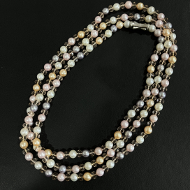 今回のロングネックレスはニュアンスなカラーが使用されており、程よい大きさのパールで首元を華やかにしてくれます。1連で長く首からかけることはもちろん、2連にしても使用することができ、様々な雰囲気を持っているお品物です。