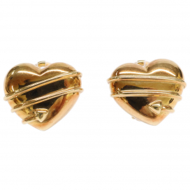 今回のお品物は、Ag750を使ったアローハートイヤリングです。愛を象徴するハートと、愛の矢を放つキューピッドを連想させる「アロー=矢」が合わさったティファニーのアイコニックなモチーフです。小さめのサイズ感ではありますが、ゴールドが使われているのもあり圧倒的な存在感のあるアイテムです。