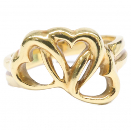 今回のお品物は、ティファニーの数あるアーカイブの中でも、普遍的な愛らしさで今なお根強い人気を誇っているトリプルハートリングです。素材には贅沢にAu750が使用されており、肌になじむような温かみのある輝きが、手元を華やかに彩ってくれます。3つのハートが重なり合うデザインは、横から見た際にも立体感があり、指を細く美しく見せてくれる計算されたフォルムが特徴です。