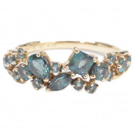 今回のお品物は、K10を使用したアレキサンドライトコフレリングです。「コフレ」は、ビズーの定番シリーズの1つで、大小さまざまなサイズの石を、まるでランダムに敷き詰めたような配置が「宝石箱」を連想させます。17石の大きさの異なるストーンを、それぞれの宝石の個性が引き立つよう、絶妙なバランスで組み合わされているのが最大の魅力です。アレキサンドライトの特徴として、白熱灯やキャンドルの下ではバーガンディ色に変わり、異なる二つの顔を楽しむことができます。