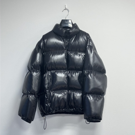 エディスリマンの美学を体現し、ナイロン素材とボリュームのあるパフデザインが特徴です。胸元の控えめなロゴと、ドローコード付きの裾が洗練されたストリートスタイルを印象づけます。上質なダウンを使用し、抜群の保温性と軽量性を誇ります。光沢あるブラックのミニマルなデザインは汎用性が高いですね。