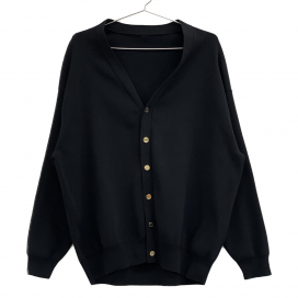 今回のお品物はシンプルですが、ゴールドのボタンや生地の質感がエレガントなカーディガンです。毛羽が少ないコットン、そしてストレッチポリエステルでできた糸が使用されているため、生地は艶があり、滑らかで美しい編地です。