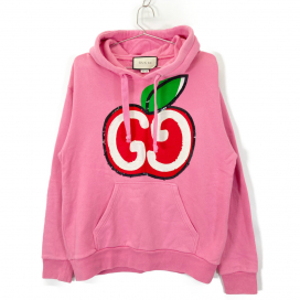 お品物はピンクのGGアップルのフーディ、610160です。スパンコールで縁取られたリンゴのモチーフロゴが可愛らしいお品物です。