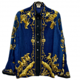 今回ご紹介するのは、エルメスの黄金期とも言える80年代のヴィンテージシャツです。エルメスのアイデンティティである「馬車」と「馬」が躍動感たっぷりに描かれており、深いネイビーにゴールドのプリントが映える、非常にエレガントな一着です。近年、こうした「ヴィンテージ・エルメス」は世界的にコレクターズアイテムとして需要が高まっており、現代の既製服にはない圧倒的なシルクの質感を堪能できる逸品です。