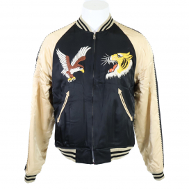 お品物は、明仙縫製のガン虎のリバーシブルのスカジャンです。リバーシブルで着用可能で、それぞれカラーも異なるので、違った印象を与えることができますね。明仙縫製とは、戦後から今に至るまでスカジャンを作っている縫製工場の起源です。繊細で鮮やかな刺繍が美しいですね。