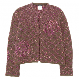 今回のお品物は洗練されたツイード調の生地に、ブランドアイコンであるカメリアと「COCO」のモチーフがさりげなく織り込まれた、非常に華やかで存在感のある一着です。落ち着いたブラウンを基調としながらも、ピンクやラベンダー、コーラル系の糸が繊細に編み込まれており、上品さと華やかさを兼ね備えたデザインは、華やかな雰囲気を演出しています。さっと羽織るだけでコーディネートが一気にエレガントにまとまる万能アイテムです。フロントはボタンレス仕様で、ラフに着こなしても上質さが際立ちます。