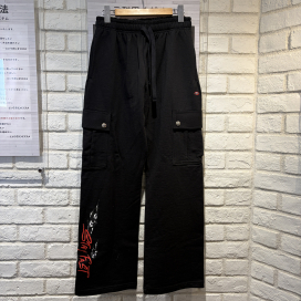今回のお品物は、男女ともに使えるデザインのパンツです。クロスボタンが施されており、シルバーアクセサリーで有名なクロムハーツらしさがあります。カーゴパンツですが、裾に向けて広がっているシルエットなので、脚がきれいに見えます。