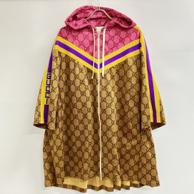 お買取したお品物は、グッチの550596 GG柄 バックプリーツ テクニカルジャージ ジップアップフーディです。全面にあしらわれたGGパターンに、ピンク、イエロー、パープルのコントラストが効いたラインデザインが印象的な一着です。背面にはプリーツ仕様が採用されており、スポーティーさの中にもグッチらしいモード感があります。テクニカルジャージ素材を使用しているため、着心地の良さとデザイン性を兼ね備えたアイテムです。状態は美品で、使用感も少なく、全体的に非常に良好なコンディションでしたので、しっかりと評価した査定額をご提示いたしました。