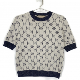 今回ご紹介するお品物はGGラメのジャカードトップス、692717です。上品なベージュ地に、ブランドを象徴するGGパターンが全体にあしらわれたラメ入りのジャカードニットです。ネイビーのリブが全体を引き締め、シンプルながらも華やかな印象を与える一着です。ショートスリーブ仕様で、ジャケットやアウターのインナーとしても活躍し、季節を問わず幅広いコーディネートに対応できる万能アイテムです。