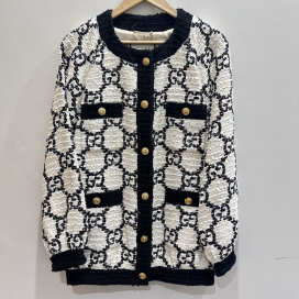 今回のお品物は、アイボリー×ブラックのシンプルな配色に、インターロッキングGボタンのゴールドがアクセントのツイードジャケットです。どんなコーデにも、一枚羽織るだけで華やかな印象になるお品物です。