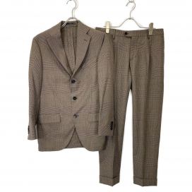 グレンチェック柄の3Bジャケットとパンツのセットアップです。イタリアクラシコの代表格ともいえる、上品で洗練された佇まいが印象的な一着です。程よくシェイプの効いたシルエットと、落ち着きのあるブラウングレンチェック柄が絶妙にマッチしており、ビジネスシーンはもちろん、カジュアルなセットアップスタイルにも応用できる万能アイテムです。袖口には本切羽仕様、パンツはダブル仕上げとなっており、細部にもこだわりを感じられる逸品です。