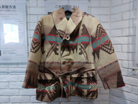 今回のお品物は、ポロカントリーのネイティブ柄のベルテッドブランケットコートです。こちらはラルフローレンのヴィンテージ系ラインから出ているアイテムで、年代は80~90年代のコートです。大胆なネイティブ柄で、圧倒的な存在感がありますね。ポロカントリーは88~92年の間のみ展開されていたラインで、現在のダブルアールエルの前身と言われているモデルです。