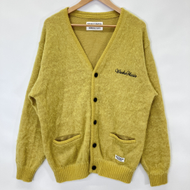 今回のお品物は、鮮やかなイエローカラーが目を引くウールカーディガンです。柔らかな風合いと起毛感のある素材使いが特徴で、シンプルなデザインながら存在感のある一着に仕上がっています。胸元にはワコマリアらしいロゴ刺繍が施され、さりげないアクセントになっています。フロントボタン仕様で着回しやすく、秋冬シーズンのコーディネートの主役として活躍するアイテムです。