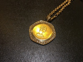 今回、お売りいただいたペンダントは24kの金貨がトップになっています。金貨は1オンスの重さでメダルの枠やチェーンの重量もしっかりあったので高価買取に繋がりました。コインの枠にダイヤモンドがあしらわれているお品物だったのですが、当店ではメレダイヤの価格もしっかりとお付けしております。