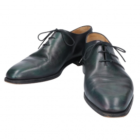 今回ご紹介するお品物はオックスフォードシューズのアレッサンドロです。アレッサンドロはブランドを代表する一枚革仕立てのオックスフォードシューズで、ブランドを象徴するモデルとして長年愛され続けています。中でも今回のお品物は、独特な色合いが魅力のパティーヌ仕上げ。深みのあるグリーン系のグラデーションが美しく、まるで芸術品のような仕上がりです。
