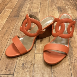 こちらのサンダルですが、モデル名がビキニと言います。柔らかい質の良いカーフレザーを用いて作られており、上品な印象を受けるお品物です。代表的なモチーフであるシェーヌダンクルを大きくアッパー部分にデザインされており、5cm程度のヒール高があるため、足長効果もあるモデルです。