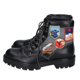 今回ご紹介するのは、マウンテンブーツから着想を得たタフでラグジュアリーな「オーベルカンフライン」のショートブーツです。モノグラム・キャンバスと上質なレザーを組み合わせたデザインは、ルイヴィトンらしい品格を漂わせつつも、武骨でメンズライクな足元を演出してくれます。2018年モデルではありますが、現在もストリートやモードな装いにマッチする名作として、中古市場でも根強い人気を誇る一足です。