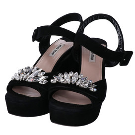 こんにちは、エコスタイル銀座本店です。お客様からミュウミュウの黒のビジュー付きのアンクルストラップのスエード素材のチャンキーヒールのサンダルを買取ましたので、ご紹介いたします。