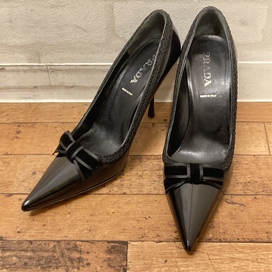 こんにちは、エコスタイル銀座本店です。お客様からプラダのブラックのレザー素材を使用したリボン×レースデザインのポインテッドトゥパンプスを買取ましたので、ご紹介いたします。
