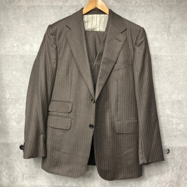 お売りくださりましたスーツは、ブランドを代表するコレクションの一つである、ベルグレイブというシリーズです。特徴としては、スリムなシルエットが素敵なお品物です。ブラウンカラーにアイボリー系のストライプ柄で、ジャケットは英国らしいチェンジポケットのため、ブランドの“らしさ”を感じられるお品物ではないでしょうか。