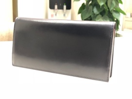 今回買取したのはガンゾの二つ折り長財布です。使用しているのはコードバンレザーです。現行品でも販売されている定番の長財布ですが、今回のお財布は「伊勢丹別注」のモデルです。見分け方は内側の色です。オリジナルのカラーリングはキャメルの様な明るい茶色になっているのですが、今回のモデルは黒になっている事が大きな違いです。