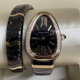 今回のお品物は、セルペンティ スピガのダイヤベゼルのクオーツ時計、103060です。蛇は「永遠」「再生」「知恵」を象徴するモチーフであり、ブルガリのアイコンです。「スピガ」はイタリア語で「麦の穂」を意味し、古代の豊かな伝統的な編み込みからインスピレーションを得た、非常に独創的なデザインが特徴です。蛇が腕に巻き付くようなデザインのブレスレットウォッチや、鱗を模したデザインのジュエリーが多く展開されています。