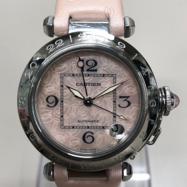 今回のお品物は、カルティエの自動巻き時計です。2004年のクリスマス限定モデルとして登場しました。ピンクシェルに2Cロゴがびっしりとデザインされているのが最大の特徴です。定番の「パシャ」ですが、「メリディアン」はGMT機構搭載のモデルとなっており、かわいらしいだけでなく実用面でも活躍してくれること間違いなしのモデルです。