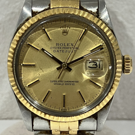 今回のお品物は、ステンレススチールとイエローゴールドのコンビ仕様に、シャンパンゴールド文字盤で、現行モデルにはない温かみと高級感はある時計です。搭載されているCal.3035は、日付の早送りが可能なクイックチェンジ機能を初めて備えたムーブメントであり、40年前の時計ながら現代のライフスタイルでもストレスなく使用できます。