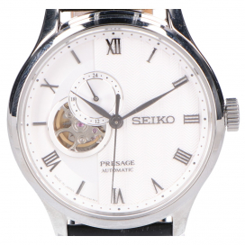 今回のお品物は、プレザージュ ジャパニーズガーデンの腕時計、SARY093です。プレサージュは、「日本の美意識」と「機械式時計の技術」を融合させたコレクションです。こちらは日本庭園からインスピレーションを得たデザインのアイテムです。日本の伝統的な美意識である「余白の美」を取り入れ、ダイヤルには砂紋を連想されるような立体模様が施されています。オープンハート仕様であるため、機械式時計ならではの美しい構造が魅力的です。