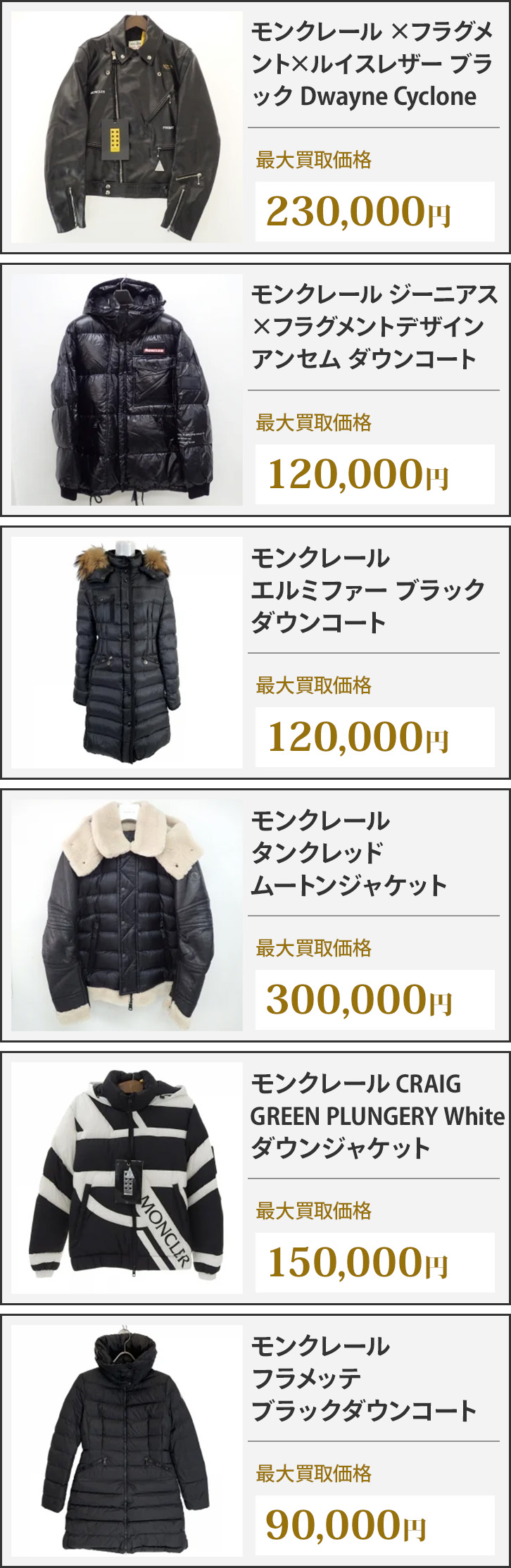 ダウンジャケットは主に冬のアイテムなので、一般的には需要が高まる秋口に買取に出した方が買取金額が高くなると言われています。 しかし、ダウンなどの服飾品は一部希少モデルを除き、新しい物ほど高く売れます。モンクレール定番商品